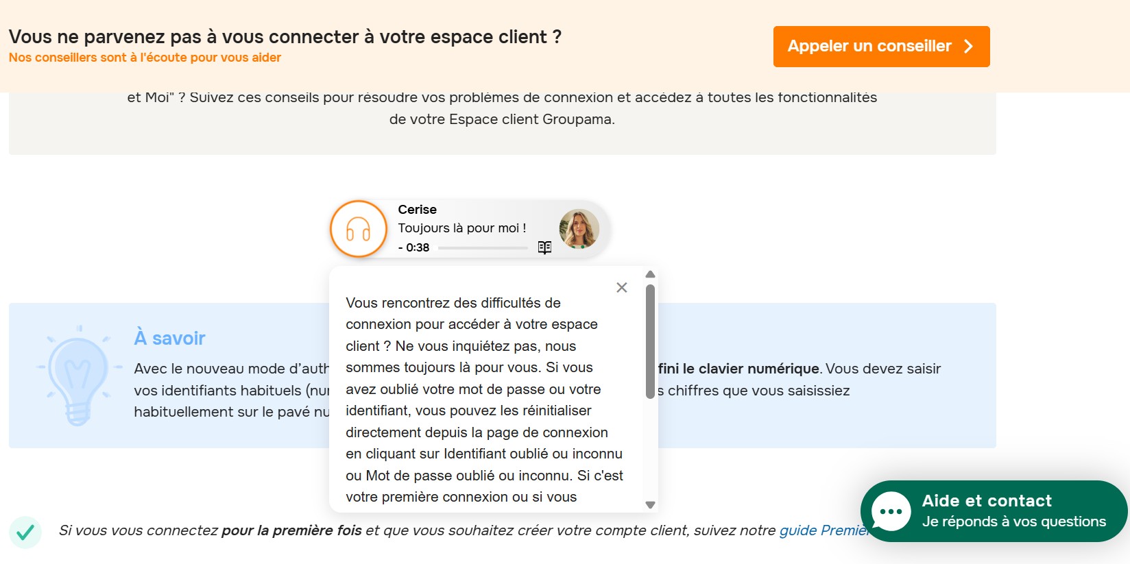 Capture de la page d’accueil de Groupama avec une capsule audio en lecture